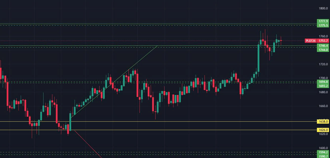 Giá Bạch kim kỳ hạn tháng 1/2026 (PLEF26) tiếp tục xu hướng tăng và đã vượt đỉnh cũ. Phiên hôm nay, dự báo giá giằng co vùng đỉnh 172x – 1770. Nếu giảm thủng 1720, giá có thể về lại 168x.