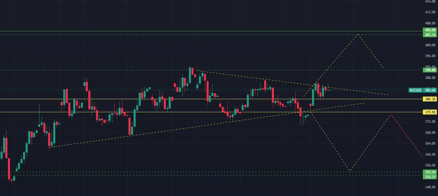 Giá Cà phê Arabica kỳ hạn tháng 12/2025 (KCEZ25) tăng trở lại và tiếp tục giằng co quanh vùng đỉnh (trong vùng 37x – 38x), duy trì vùng giá cao và duy trì trạng thái cân bằng tạm thời quanh vùng này.