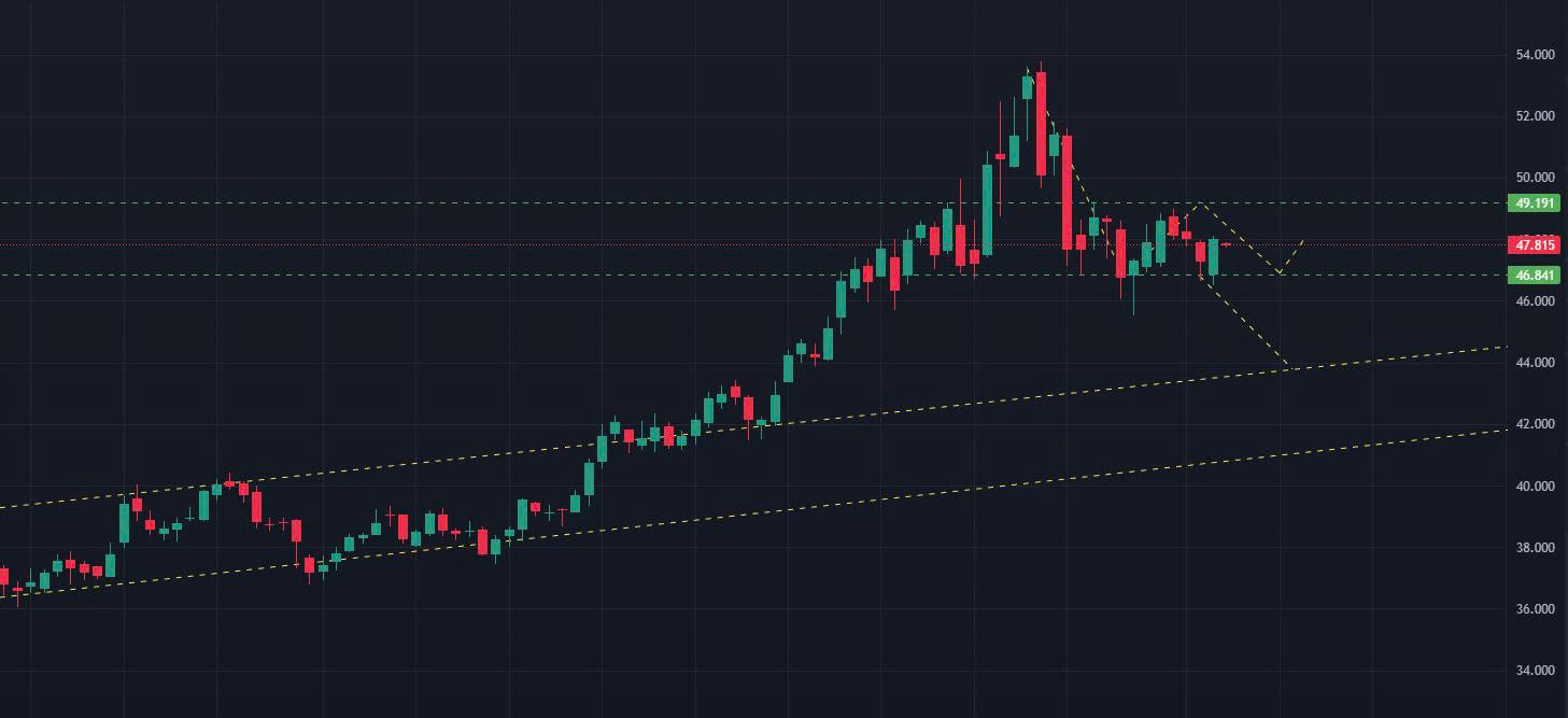 Phiên hôm nay, nếu đầu phiên tăng vượt 47.85, dự báo giá tiếp tục hồi phục và có thể lên vùng 48.5x. Nếu đầu phiên giảm thủng 47.7, giá có thể điều chỉnh về lại 47.1.