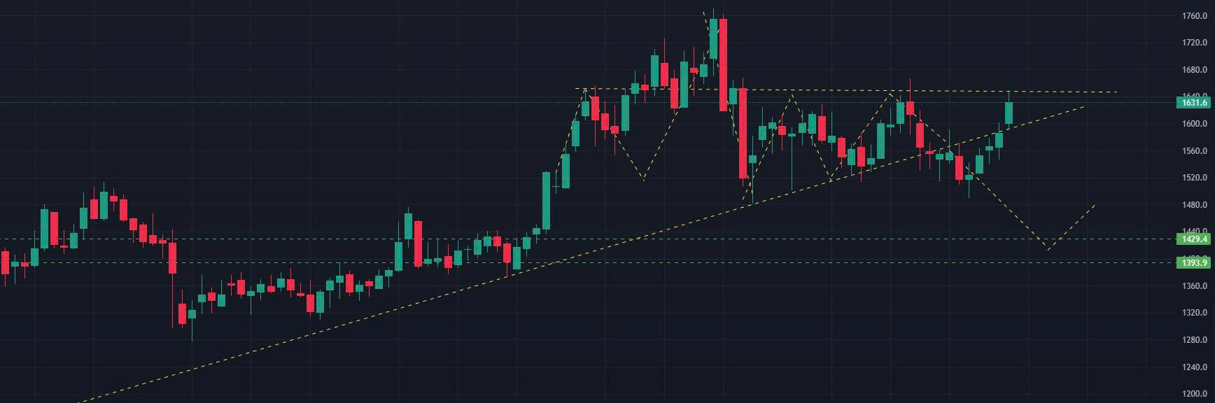 Nếu duy trì trên 1623, dự báo giá tiếp tục tăng lên vùng 1657 – 1659 sau đó có nhịp điều chỉnh (và giằng co vùng 162x – 165x). Nếu giảm thủng 1619, giá có thể về lại vùng 1594 – 1596.