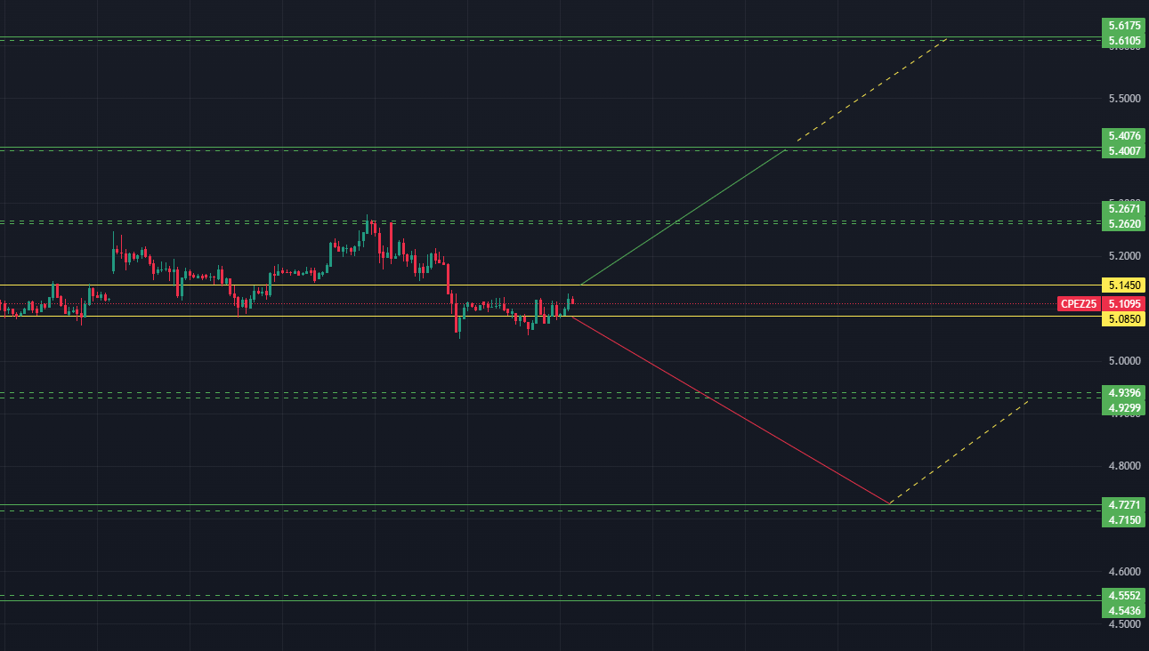 Trên khung 1W, giá Đồng COMEX kỳ hạn tháng 12/2025 (CPEZ25) đầu tuần trước đã có nỗ lực vượt kháng cự kênh nhưng không thành công. Cuối tuần, giá giảm trở lại và duy trì bên trong kênh sideway up. Sau 2 tuần nỗ lực vượt kháng cự nhưng không thành công, dự báo tuần này giá CPEZ25 tiếp tục điều chỉnh và duy trì bên trong kênh.