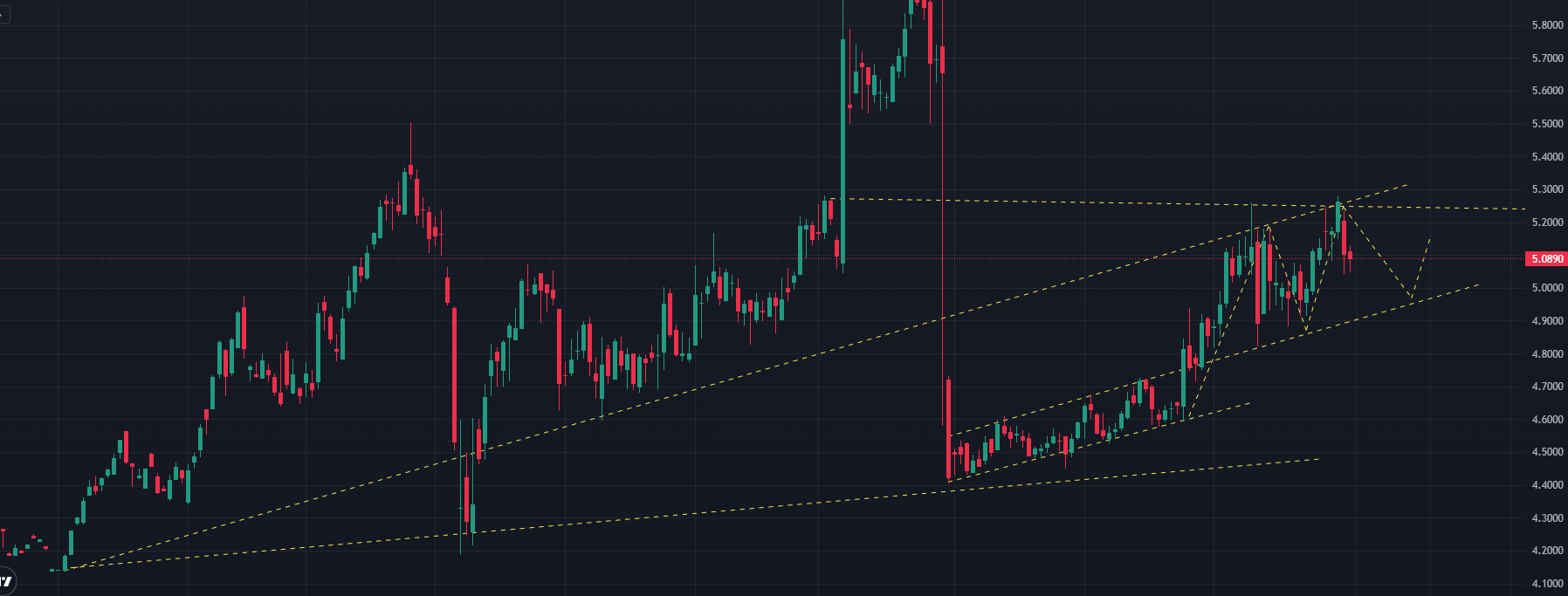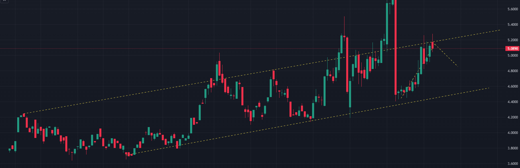 - Nếu đầu tuần tăng, vượt 5.145, dự báo giá tăng lên vùng 5.40 – 5.41, tăng mạnh có thể lên vùng 5.61 – 5.62 (nhịp tăng có thể kéo dài sang tuần sau).