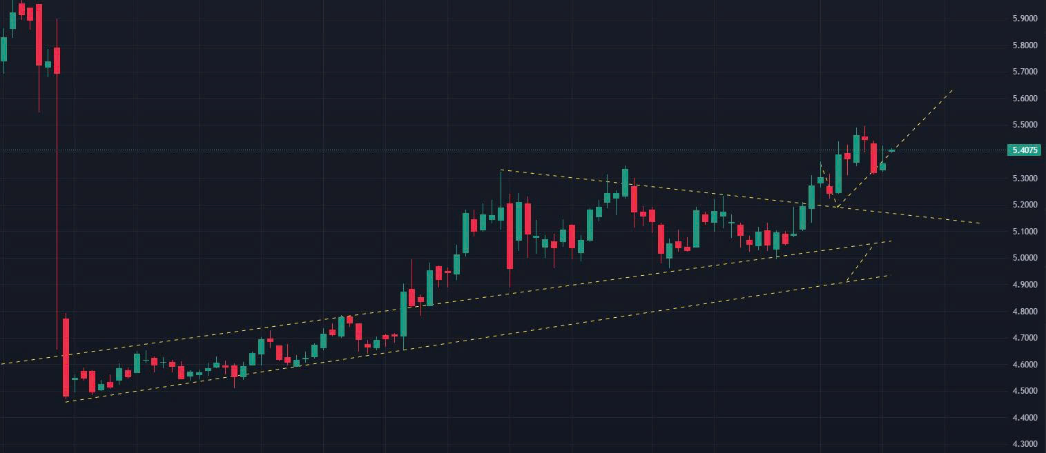 Phiên hôm nay, nếu duy trì dưới 5.415, dự báo giá tiếp tục kịch bản giảm và xuống vùng 5.35 – 5.36. Nếu tăng vượt 5.426, giá có thể lên quanh 5.48.