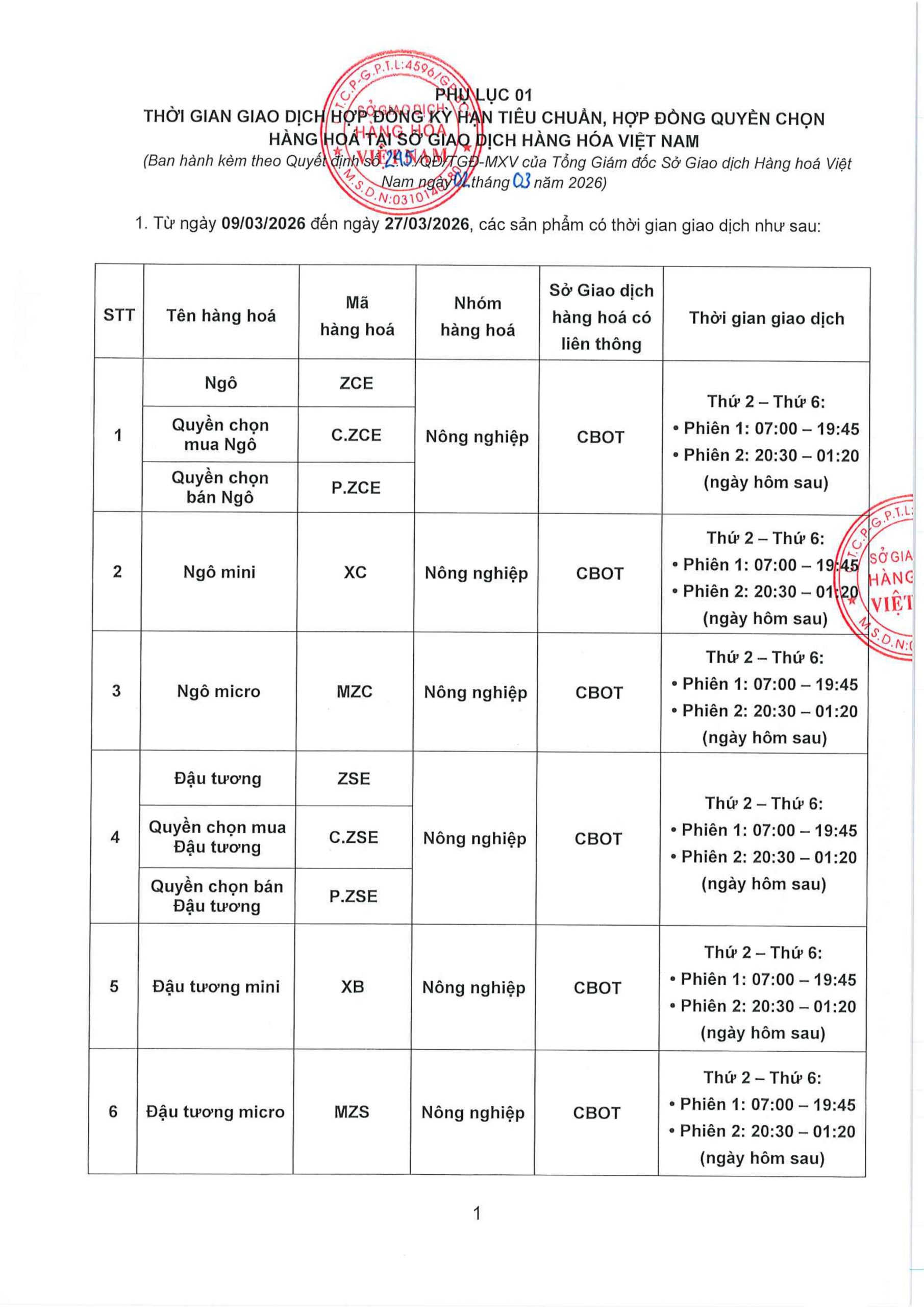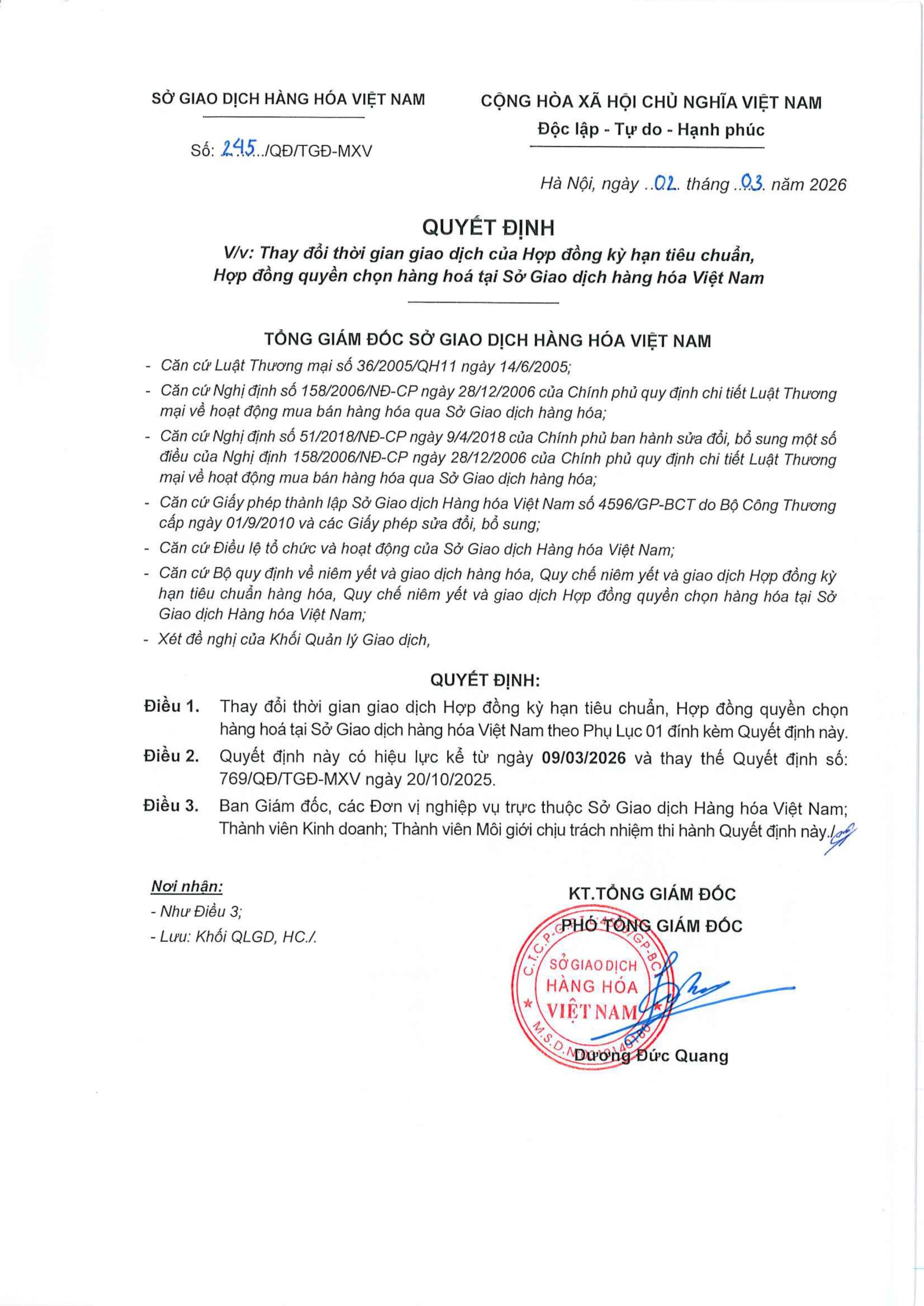 FINVEST xin gửi đến Quý Khách hàng thông báo Thay đổi thời gian giao dịch của Hợp đồng kỳ hạn tiêu chuẩn và Hợp đồng Quyền chọn hàng hóa, theo Quyết định số 245/QĐ/TGĐ-MXV ngày 02/03/2026 của Sở Giao dịch Hàng hóa Việt Nam. Khung thời gian mới được áp dụng từ ngày 09/03/2026, cụ thể như sau: